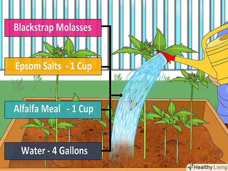 Удобрюйте сад сирою мелясою. у мелясі міститься вуглець, залізо, сірка, карбонат калію, кальцій, марганець, магній і калій, які дуже корисні для рослин. Змішайте мелясу з 1 склянкою (230 г) англійської солі і 1 склянкою (120 г) люцернового борошна. Розчиніть суміш в 15 л води і полийте сад. [4]- Меляса також додасть в грунт корисні бактерії, завдяки яким ваші рослини залишаться здоровими і щасливими.