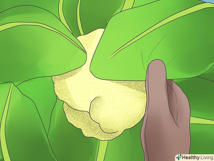 Відбіліть головку, щоб запобігти її потемніння. у міру зростання цвітної капусти, в центрі її листя починає формуватися невелика "головка". У разі, якщо на цю головку звичайної цвітної капусти падає сонячний колір під час її зростання, вона стає жовтою і темніє. Хоча потемніла головка цвітної капусти все одно їстівна, вона має менш апетитний вигляд і не таку ніжну текстуру. [12] тому важливо зберігати голівку блідою і білою за допомогою процесу, який називається "відбілювання". Коли головка буде розміром з яйце, нахиліть власні листя цвітної капусти над головкою, щоб вона була захищена від сонячного світла. При необхідності використовуйте для утримання листя джгут або гумки.- Перш ніж відбілювати головку переконайтеся, що вона суха. Якщо навколо неї збереться волога, то рослина може почати гнити. Не прив'язуйте листя головки так туго, що Повітря не зможе потрапити до неї.