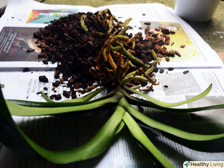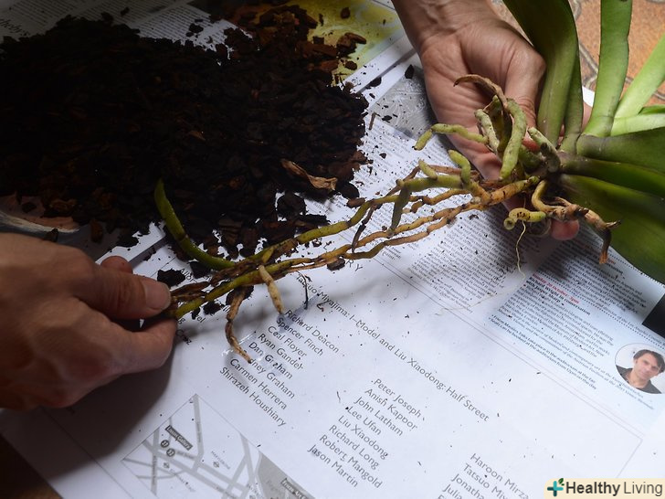 Видаліть старий посадковий матеріал і відмерлі коріння. за допомогою рук і чистих ножиць обережно прочистіть коріння. Видаліть відмерлі частини суміші-деревне вугілля – тріски, мох і так далі – і викиньте. За допомогою ножиць, відокремте всі загнили або відмерлі коріння, щоб не пошкодити здорової частини рослини.- М'які і в'ялі коріння, швидше за все, вже не життєздатні, так що сміливо видаляйте їх.