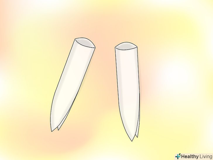 Розділіть їх і відріжте одну сторону. вони повинні бути досить тонкими, щоб ламалися, без докладання великої сили. Тепер у вас є, два схожих на ікла наконечника, на зуби. Замість того щоб обрізати задню частину соломинки, залиште як є, нею можна обернути зуби.- Якщо залишити обидві сторони, то буде можливість мати різні ікла на кожному зубі. Таким чином, зуб залишиться з частиною соломинки, яка обернеться навколо нього, а Ікло буде просто триматися спереду.