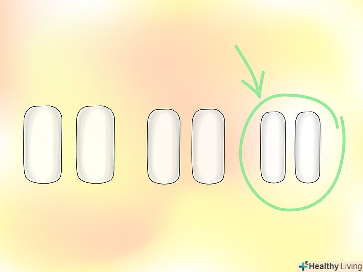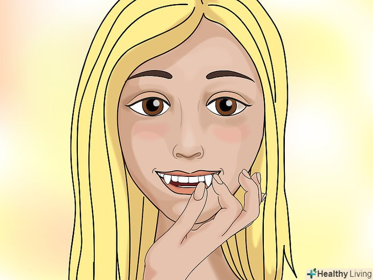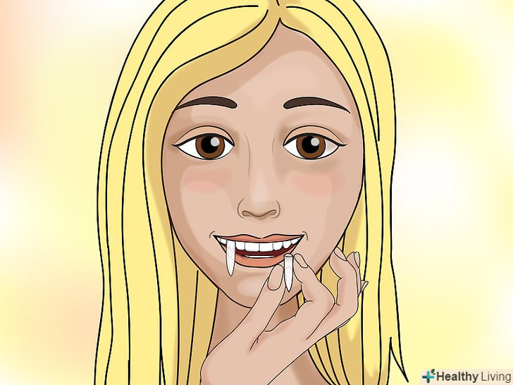 Вибирайте нігті, відповідні розміру ваших очних зубів. в упаковці будуть різні екземпляри, тому вибирайте такого ж розміру, як Ваші зуби – ті, які вже частково загострені. Деякі люди можуть навіть кусатися фальшивими нігтями, як справжніми іклами. Ти можеш прикріпити їх, без допомоги?- Якщо хочете, можете надіти їх на бічні різці (ті, що знаходяться праворуч і ліворуч від двох ваших передніх зубів). Деякі вважають, що так їх більше видно і виглядають краще.