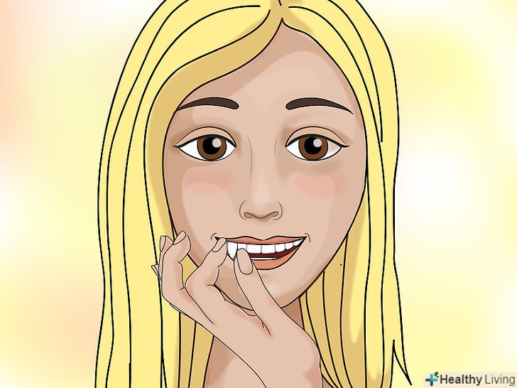 Приклейте їх на клей від зубного протеза. Вам не потрібно дуже багато – тільки крапля. Будь-який колір підійде, але буде краще, якщо ви знайдете білий або світлий.- Не використовуйте клей для нігтів. Або супер клей. Або будь-який інший клей подібного складу. Мало того, що це токсично, але до того ж ви не зможете зняти нігті, приклеєні до ваших зубів.