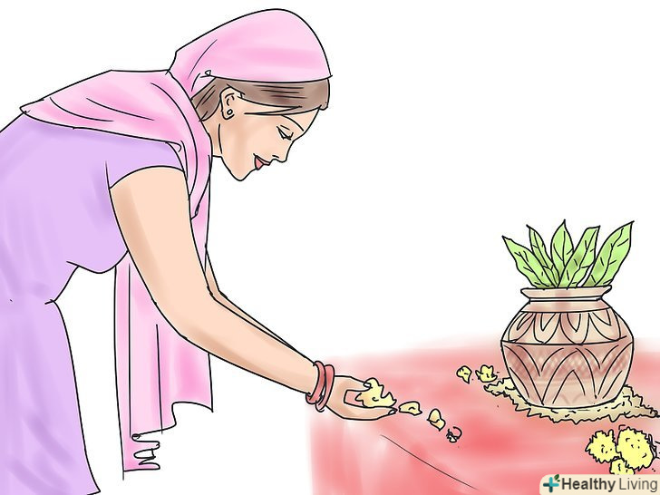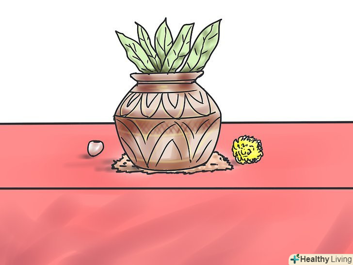 Поставте калаш. помістіть калаш в середині. Залийте його водою на 75% і покладіть один супарі, одну квітку календули, монету і кілька зерен рису. Покладіть в калаш 5 листя манго і сформуйте з них коло на шийці калаша.