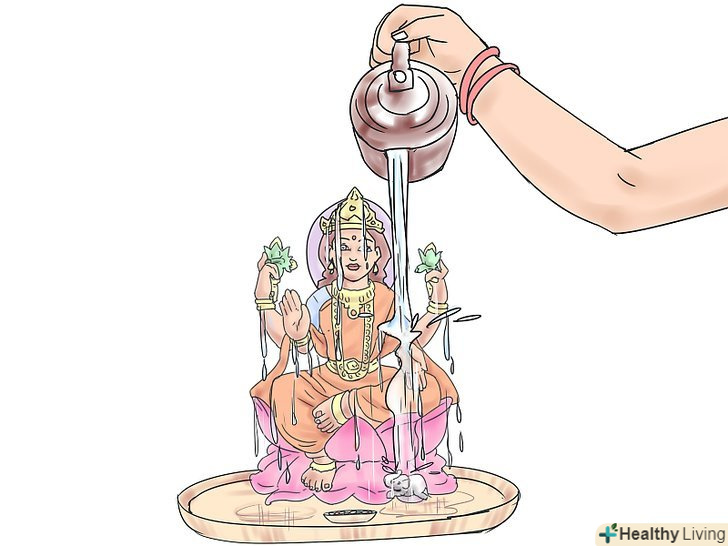 Викупайте ідола Лакшмі. тепер візьміть ідол Лакшмі, і помістіть його в тхалі. Викупайте його водою з панчамритой. Знову очистіть його водою. Протріть ідол і помістіть його назад на калаш.