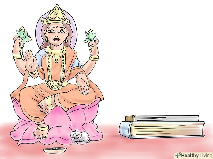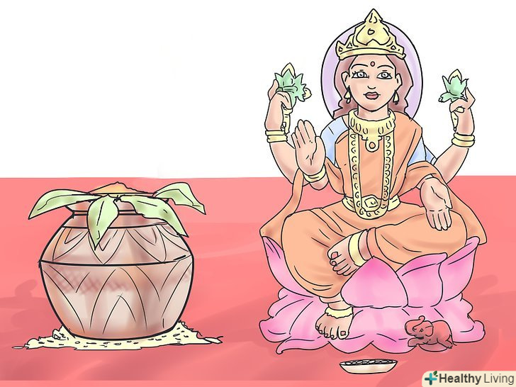 Поставте Богиню Лакшмі. Тримайте невеликий Пуджа тхалі на калаші і зробіть маленьку плоску гірку з зерен рису. Намалюйте над ним лотос Халді і помістіть в центрі ідол або Богиню Лакшмі. Поставте перед нею кілька монет.
