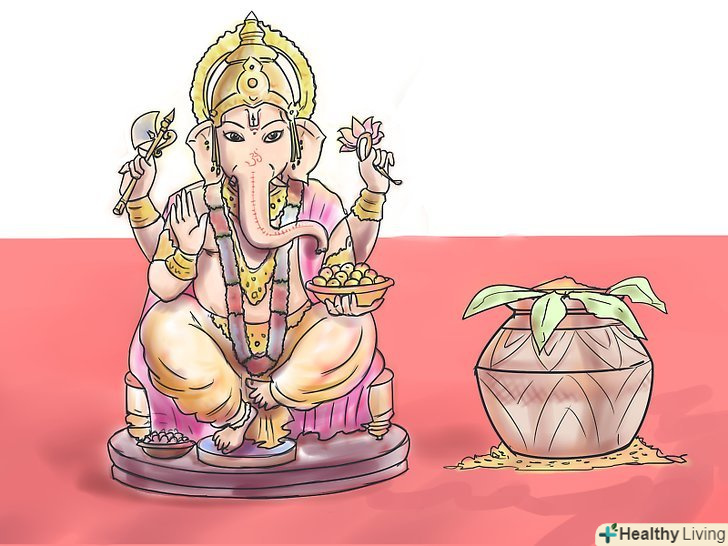 Помістіть ідол бога Ганеші. Богу Ганеша надається головне значення в кожному Пуджі. Тому, з правого боку (в південно-західному напрямку) калаша розмістіть ідол Ганеші. Нанесіть Тілак з Халді і кумкума. Покладіть до ідола кілька зерен рису.