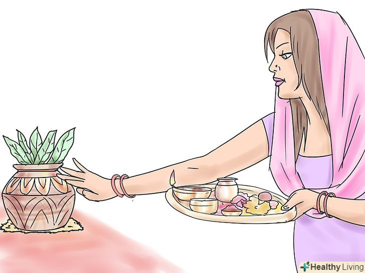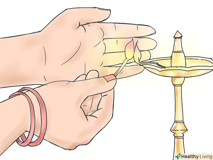 Освітіть дійа. освітлюйте Дейя і помістіть його в тхалі поруч з Халді, кумкумом і рисовими зернами. (Сандалова паста, паста шафран, Абір і гулал необов'язкові)