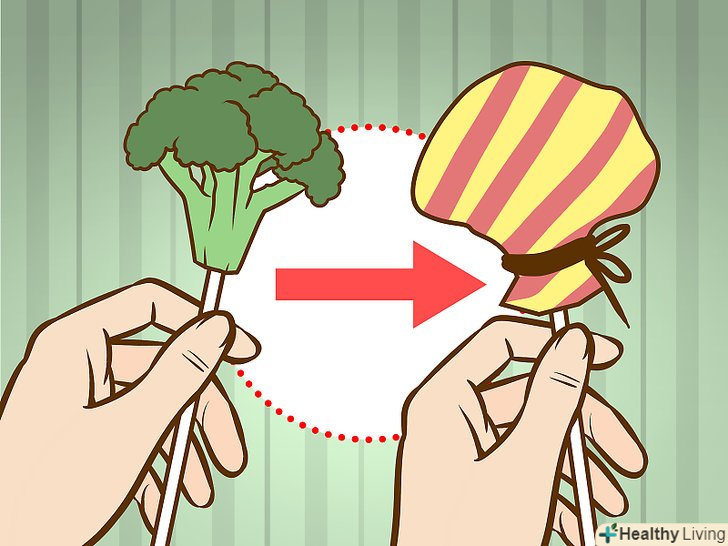 Приготуйте фальшиві льодяники з брокколі. льодяники з брокколі будуть чудовим жартом, особливо якщо у вас є діти. Вони подумають, що ви збираєтеся пригостити їх солодощами, а, насправді ви дасте їм брокколі. Майте на увазі, що зовсім маленькі діти можуть не оцінити цей жарт, тому варто заздалегідь купити справжні льодяники, щоб порадувати дітей після розіграшу. [4]- Купіть палички для льодяників і кілька шматочків вощеного паперу розміром 15 на 15 см (все це можна придбати в магазині товарів для рукоділля). Ще потрібно купити кольоровий Папір для упаковки.
