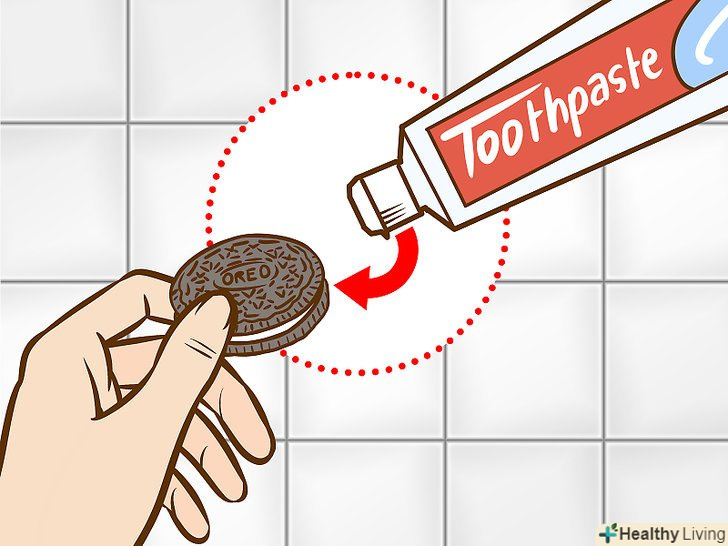 - Тепер нанесіть на середину однієї зі сторін печива трохи зубної пасти. Рівномірно розмажте її по всій поверхні і накрийте зверху другим печивом.