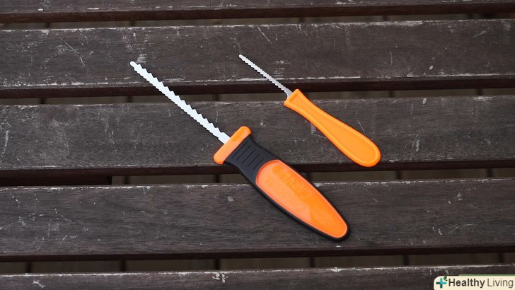 Візьміть відповідний ніж. це може бути зазубрений ніж для хліба, ніж для гіпсокартону або спеціальний зазубрений ніж з набору для різання гарбуза. Розріжте, як ніби ви пиляєте колоду (не натискайте на ніж, а рухайте вперед-назад). Якщо можна, не використовуйте ніж з рівним лезом. Коли будете розрізати гарбуз наскрізь, вам доведеться більше натискати силою і менше контролювати лезо.