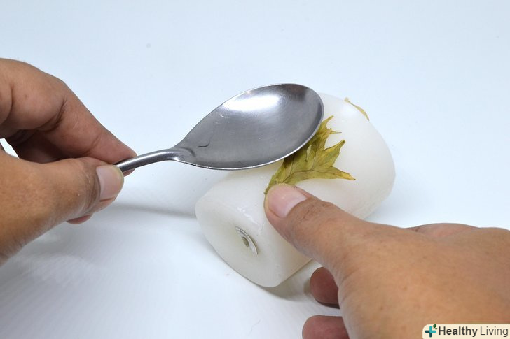 Ложкою притисніть до товстої свічці сухий квітка. Візьміть товсту пряму свічку, яку збираєтеся прикрасити, і покладіть її набік. Прикладіть до свічки висушений квітка, а потім притисніть його нагрітої ложкою. Зачекайте кілька секунд і приберіть ложку. [10]- Якщо віск не розм'якшується, то ложка недостатньо гаряча. Ще раз нагрійте її над полум'ям.