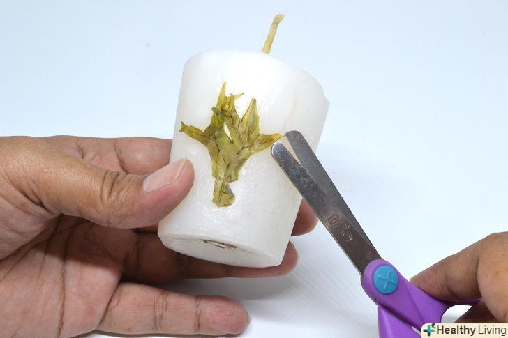 Зріжте невеликими ножицями зайві ділянки стебел, пелюсток або листя. огляньте свічку і зверніть увагу на стебла, пелюстки і листя, які стирчать з воску. Ображати зайві стирчать деталі невеликими ножицями. Особливо добре підійдуть для такої роботи манікюрні ножиці. [11]