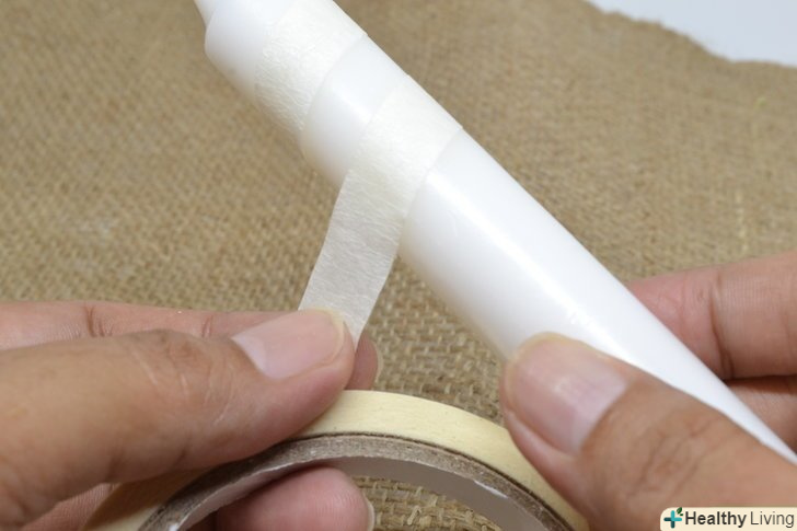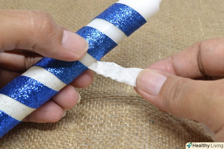 Заклейте малярським скотчем ті ділянки свічки, на які не повинні потрапити блискітки. при бажанні можна прикрасити блискітками всю свічку повністю або тільки частково. Наприклад, у вас є можливість покрити її блискітками тільки наполовину або нанести візерунок у вигляді блискучих смужок. Якщо ви вирішили прикрасити свічку лише місцями, заклейте малярським скотчем ті її ділянки, на які не повинні потрапити блискітки. [1]- Замість цього можна наклеїти на свічку трафарет, щоб потім отримати на її поверхні блискучу фігуру конкретної форми, наприклад, сердечко або зірку.