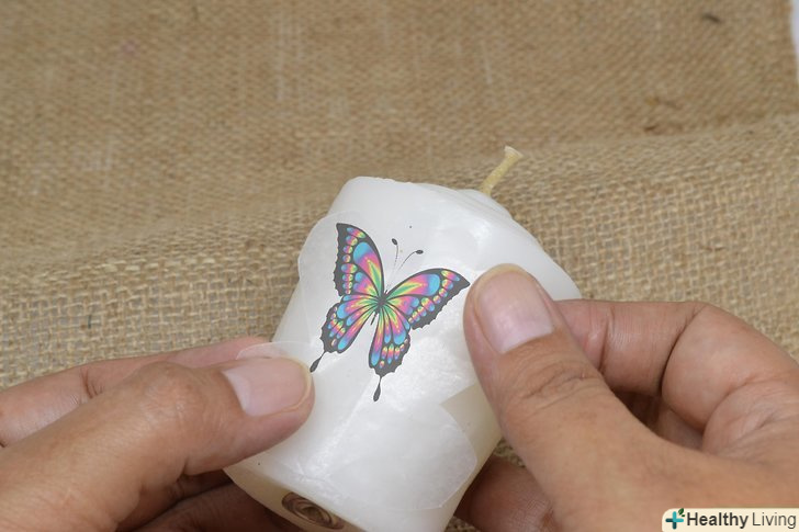 Зніміть вощений папір зі свічки, залишивши малюнок на місці. серветка разом з роздрукованим на ній зображенням повинна вклеїтися в поверхню свічки. Тепер прикрашену свічку можна використовувати за призначенням. [22]