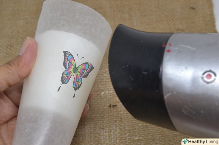 Щільно обтягніть свічку вощеним папером і нагрівайте її до тих пір, поки та не стане блискучою. це можна зробити будівельним феном, тепловою гарматою або феном для волосся. Працюйте невеликими ділянками, роблячи папір блискучою. Тривалість процесу буде залежати від того, яким інструментом Ви користуєтеся. Будівельний фен впорається з цим завданням помітно швидше, ніж фен для волосся. [21]- Якщо ваше зображення покриває всю поверхню свічки, обертайте її під час роботи, щоб обов'язково прогріти всі ділянки.