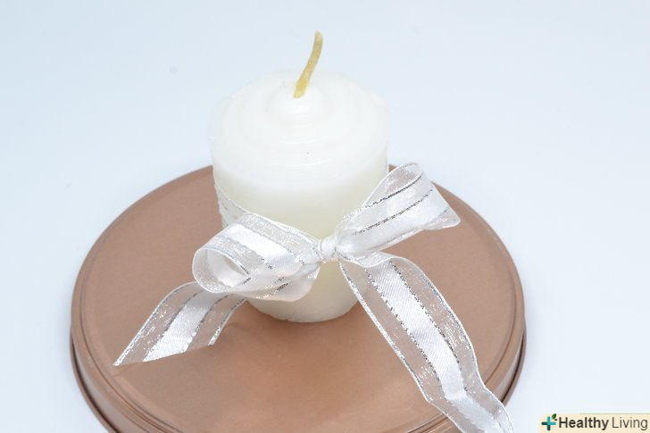 Обклейте свічку широкою стрічкою, якщо хочете додати їй трохи кольору. виміряйте окружність свічки, потім додайте до мірки 1,5–2,5 см для нахлеста. Відріжте шматок стрічки відповідного розміру і оберніть їм свічку. Накладіть кінці стрічки один на одного і скріпіть декількома краплями клею.- Щоб домогтися ще більш ошатного ефекту, спробуйте взяти довгий відрізок вузької стрічки і пов'язати її на свічку красивим бантиком.