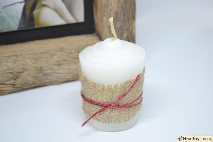 Прикрасьте свічку мереживом і полотняною стрічкою в сільському стилі. оберніть свічку посередині відрізком широкої полотняної стрічки і склейте його кінці. Поверх полотняної стрічки накладіть відрізок більш вузької мереживної стрічки і також склейте його кінці. [23]- Мереживна стрічка повинна бути рівною без рюшок.