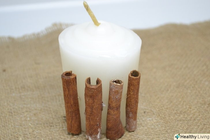 Для додаткового ароматичного ефекту оберніть свічку паличками кориці. за допомогою гарячого клею обклейте свічку по всьому периметру вертикально поставленими паличками кориці. Простежте за тим, щоб всі палички йшли врівень з нижнім краєм свічки. Пов'яжіть мотузку або стрічку поверх коричних паличок, щоб краще зафіксувати їх, і зав'яжіть бантик. [24]- При бажанні, щоб зробити свічку ще нарядно, підсуньте під мотузку гілочку сосни або падуба.