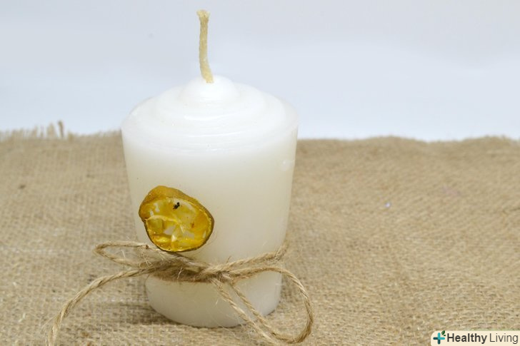 Для святкового ефекту оберніть свічку сушеними часточками апельсина. приготуйте або купіть сушені апельсинові часточки. За допомогою гарячого клею наклейте їх по колу в підставі або посередині свічки. Пов'яжіть мотузку поверх часточок і зав'яжіть її бантиком.- Найкраще використовувати свічки без ароматичних ароматів, але також можна взяти свічку з запахом ванілі, щоб отримати аромат, схожий на запах апельсинового морозива.