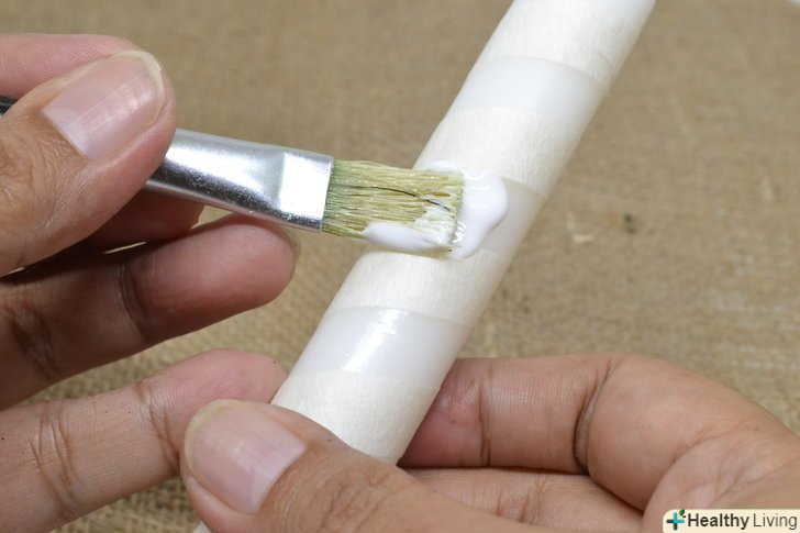 Нанесіть на свічку клей для декупажу. скористатися можна будь-яким видом клею для декупажу, яким побажаєте. Нанесіть його широким пензлем або губкою на ті ділянки свічки, які слід покрити блискітками. Намагайтеся не бруднити клеєм малярський скотч, якщо використовуєте його. Так в подальшому ви уникнете відколів на покритті з блискіток. [2]