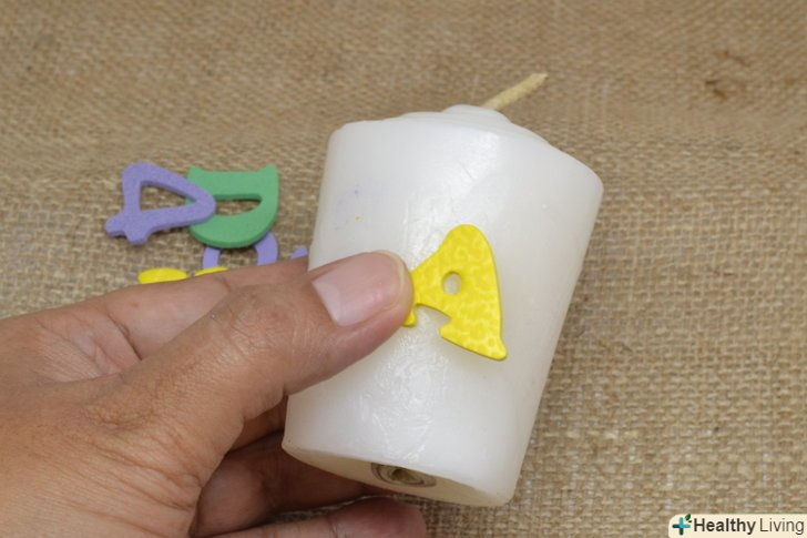 Скористайтеся матеріалами для скрапбукінгу, щоб прикрасити свічку. підшукайте красиві наклейки для скрапбукінгу у вигляді букв і прикрасьте ними свічки. Розставте свічки на столі таким чином, щоб з букв складалося слово. Також замість наклейок можна прикрасити свічки декоратінимі заклепками. [27]