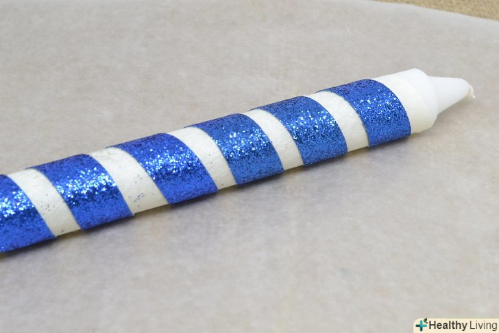Залиште свічку сохнути на аркуші цигаркового або вощеного паперу. тепер той аркуш паперу, над яким ви працювали, можна використовувати в якості воронки, щоб зсипати прокидалися блискітки назад в баночку і не дати їм прірву даром. [6] Час висихання свічки залежить від використаного вами клею. Однак, на це піде не менше пари годин.- Надлишки блискіток обсипаються зі свічки самостійно. В іншому випадку можна обережно постукати по свічці.