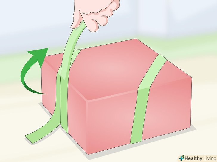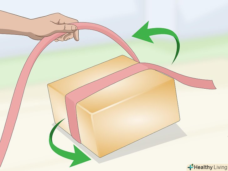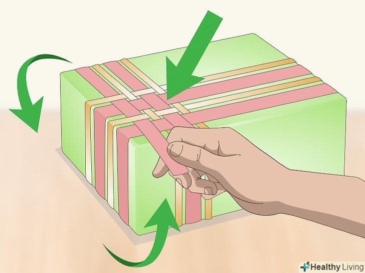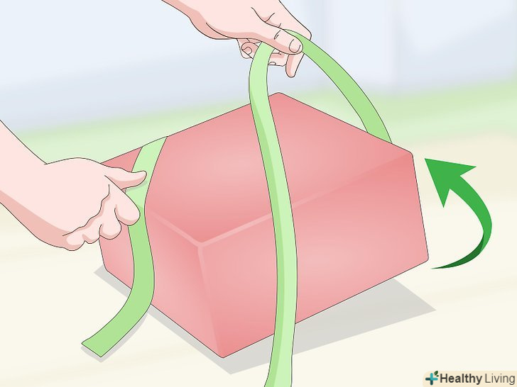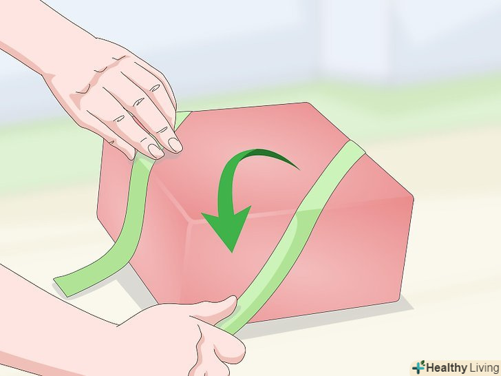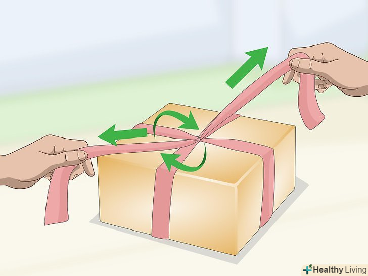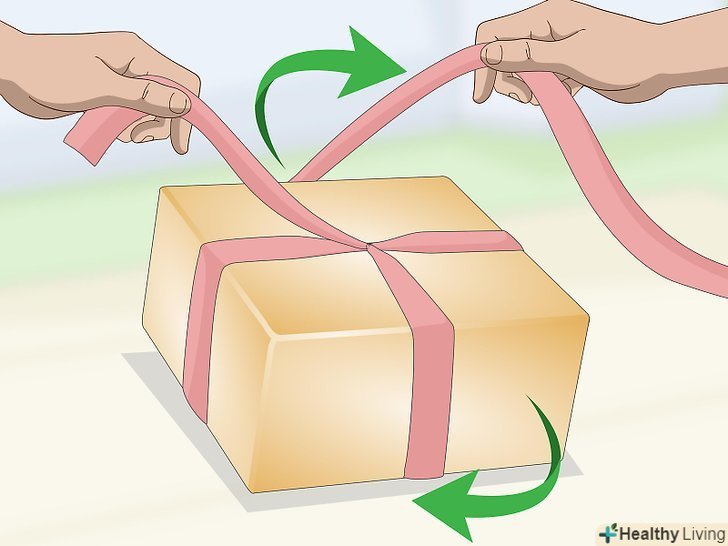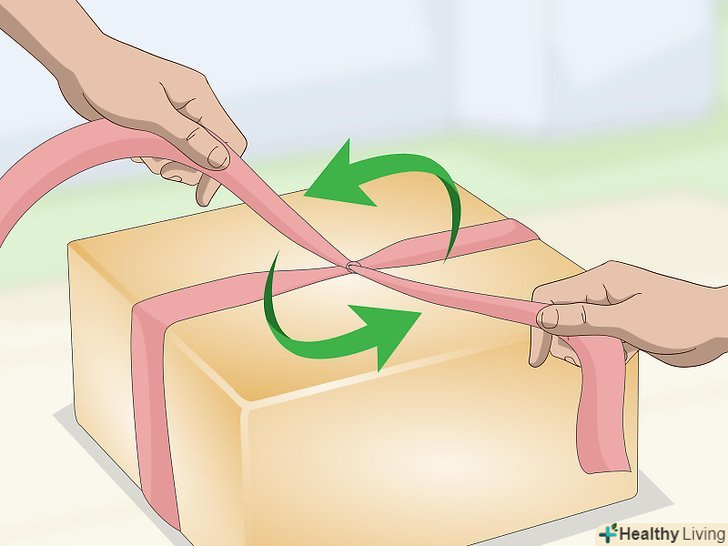 Оберніть коробку по задній стороні і витягніть стрічку до передньої частини. ще раз підніміть коробку. Протягніть довгий кінець стрічки за коробкою і витягніть з іншого боку. Знову поставте коробку. [5]- Покладіть великий палець на скручену частину, щоб вона не розкрутилася, поки ви обертаєте стрічкою задню частину коробки.