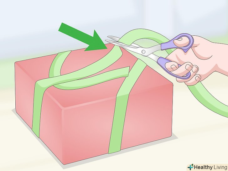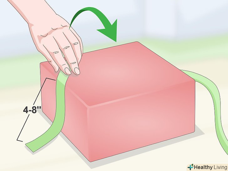Горизонтально оберніть стрічкою верх коробки. залиште один кінець довжиною 10-20 см вільно висіти збоку. Поки не відрізайте стрічку. [1]- Краще залишити багато стрічки, ніж занадто мало. Завжди можна обрізати її пізніше.