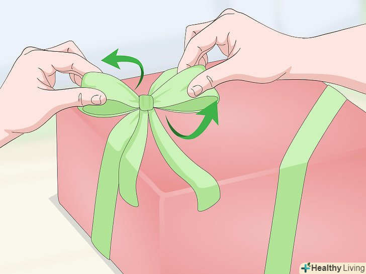 Поправте бантик і відріжте зайву довжину. підтягніть петлі і кінчики стрічки. Якщо ви використовуєте стрічку на дроті, то можна красиво розправити петлі. Для більшої вишуканості обріжте кінці стрічки під кутом або галочкою. [7]
