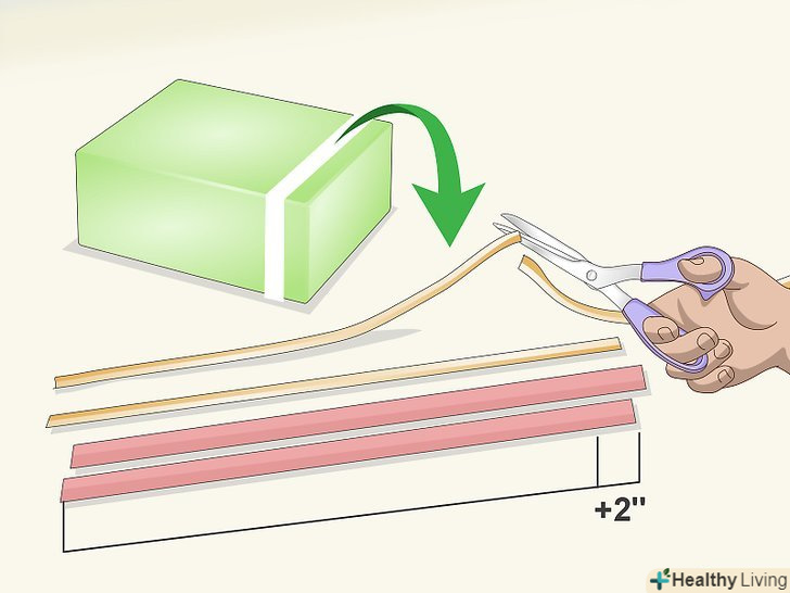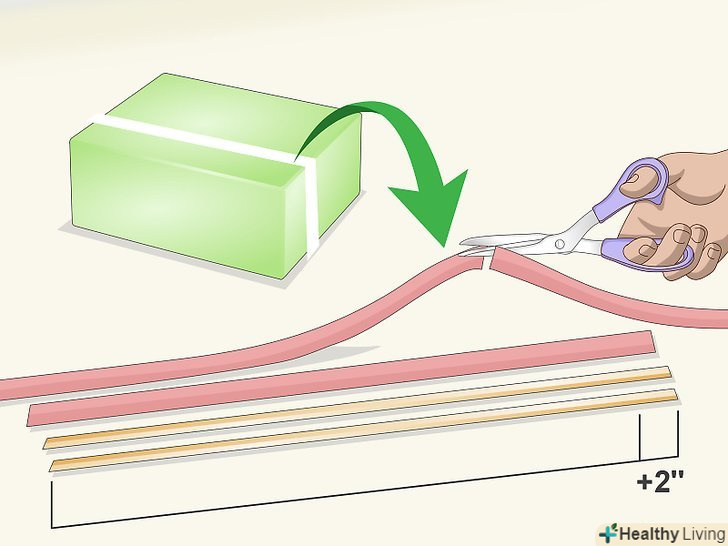 Відріжте чотири шматки стрічки по довжині коробки. знадобляться чотири досить довгих шматка стрічки, щоб обернути коробку по довжині, плюс додаткові 5 см до кожної з них. [12]- Для більшої унікальності використовуйте два шматки вузької стрічки і два шматки трохи ширшої стрічки. Або можна використовувати два контрастних кольори.