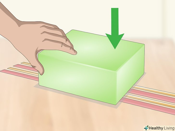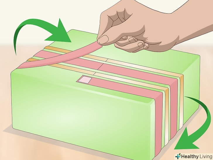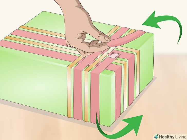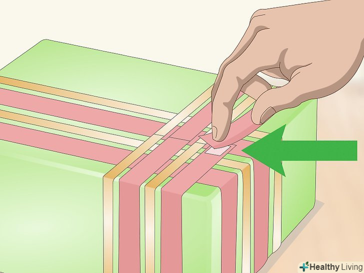 Оберніть стрічки навколо коробки і закріпіть двостороннім скотчем. обертайте і закріплюйте по одній стрічці зараз; не заклеюйте їх все відразу. Щільно підтягніть стрічки, щоб вони туго і красиво охоплювали коробку. Кінці стрічки будуть розташовуватися внахлест приблизно на 2,5 см. [15]- Переконайтеся, що прикріплюєте скотчем верхню стрічку до нижньої. Не приклеюйте стрічки до коробки.