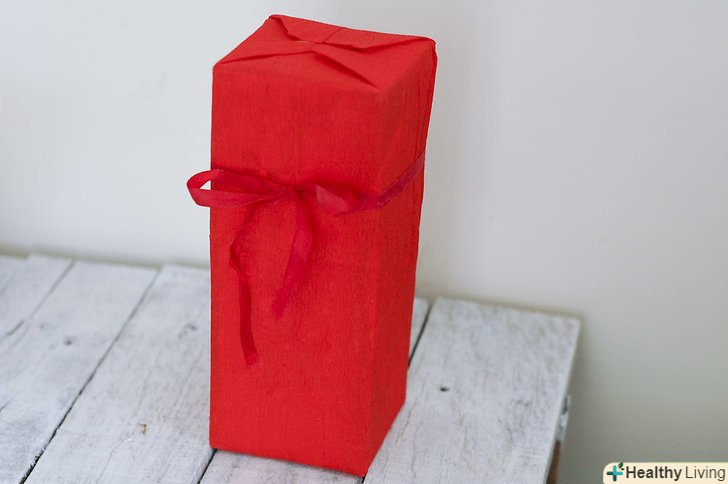 Повторіть - повторіть те ж саме на іншій стороні, складаючи частину паперу вниз, потім складаючи обгортку з боків і нижню частину вгору. склеюйте все скотчем. Якщо хочете, зав'яжіть навколо коробки бант.