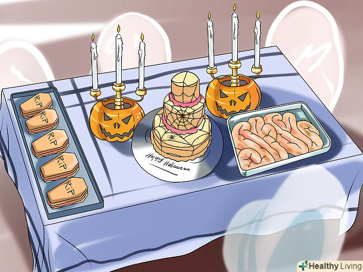 Влаштуйте обід на Хеллоуїн. на жаль, а може бути і на щастя, традиційних їжі і напоїв для цього свята немає. Неважливо, яку тематику ви вибрали, дотримуйтеся її. Бути може, вершкового пива?- Зазвичай закуски йдуть добре. Гарбузове печиво, жіночі пальчики (можна прикрасити їх пальцями відьми), яєчні очні яблука диявола і ноги павука з краба — це хіти.