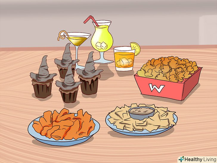 Подбайте про наявність закусок, які можна їсти без столових приладів. легкі закуски або їжа, яку можна їсти руками, є відмінним способом подачі частувань на домашній вечірці. Гості зможуть перекусити в будь-який момент свята, що допоможе підтримувати відмінний настрій протягом всієї ночі. Підготуйте закуски заздалегідь, щоб не провести всю ніч біля плити. Приготуйте достатню кількість їжі, щоб ви могли поповнювати запас закусок, які швидко з'їдять. [11]- Переконайтеся в достатній кількості їжі, що вживається руками, яка виступає в ролі основних страв і в якості доповнення до закусок. Ви повинні бути впевнені в тому, що ваші гості не будуть голодними. Такі закуски як фрикадельки, сосиски в тісті, бобовий соус і курячі крильця стануть відмінними варіантами.