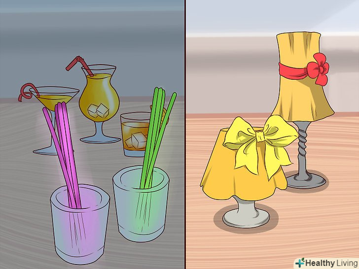 Використовуйте правильне освітлення, щоб створити відповідний настрій. застосовуване вами освітлення може створювати певну атмосферу на вечірці, тому цей аспект так важливий. Вам знадобиться хороше освітлення при вході, щоб зустрічати прибувають гостей. В основній зоні вечірки світла повинно бути мало, щоб обстановка була більш інтимною. Простір для танців має бути занурене в напівтемрява або висвітлюватися за допомогою ультрафіолетових ламп або світяться паличок. [5]- Різні види світильників зможуть створити певну атмосферу, тому подумайте про тип вечірки, яку ви влаштовуєте. Свічки і настільні лампи допоможуть створити інтимну і вишукану обстановку. Смолоскипи в полінезійському стилі та різдвяні вогні створюють святкову атмосферу.