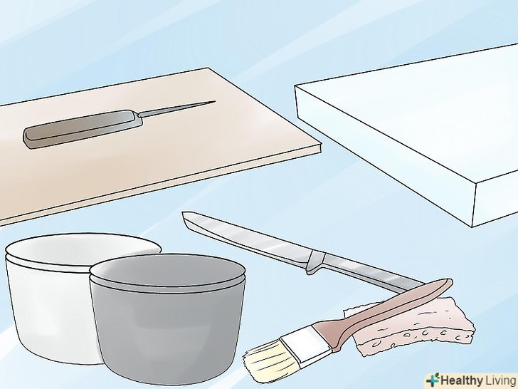 Щоб надати пінопласту форму могильної плити, використовуйте канцелярський ніж, лобзик або звичайний зубчастий ніж. Форма надгробків залежить тільки від вашої фантазії: вони можуть бути як з заокругленим верхом, так і квадратним. [4]- Виріжте кілька шматків пінопласту для більш вишуканого вигляду. Їх також можна склеїти для того щоб зробити могильну плиту ширше. Поекспериментуйте з формами. Виріжте з пінопласту арки, кола, трикутники – будь-які фігури на свій розсуд.