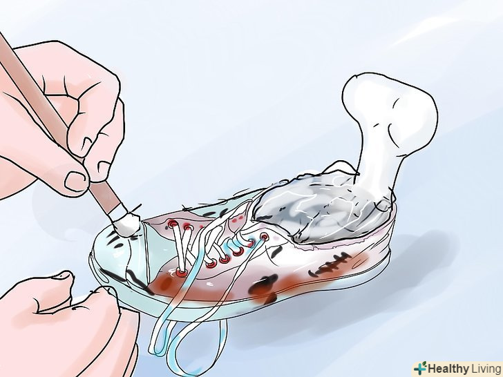 Залийте або пофарбуйте червоною фарбою верхню частину виступаючої кістки. для більш реалістичного вигляду дозвольте фарбі капати вниз по нозі і в взуття. Взуття також окропити червоною фарбою. Дайте їй висохнути.