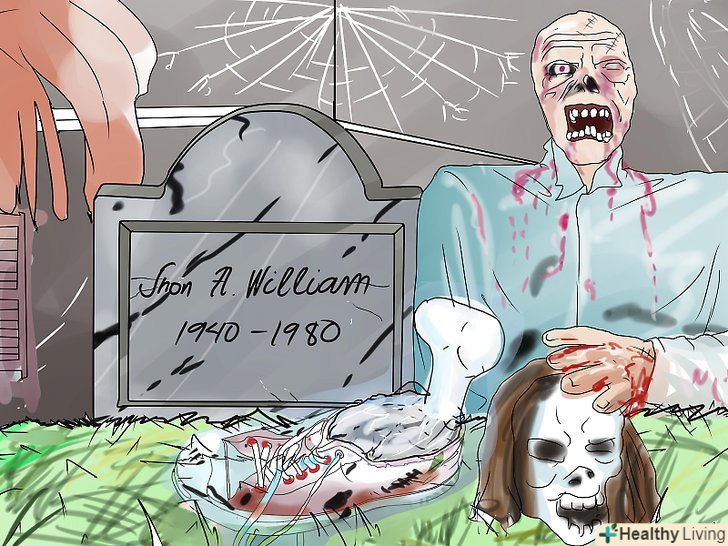 Напишіть ім'я, дату смерті та епітафію на надгробку. для цього використовуйте фарбу темного тону. Напис можна зробити як за допомогою трафарету, так і від руки. Ваші надгробні плити можуть мати смішний, реалістичний або моторошний вигляд. Сходіть на місцеве кладовище, щоб отримати уявлення про те, як повинна виглядати справжня надгробна плита.- • намалюйте букви після того, як всі шари фарби будуть нанесені, тому що напис буде краще видно, якщо зробити її в останню чергу. Для того щоб надати буквах моторошний і менш реалістичний вигляд, наведіть їх червоною фарбою.