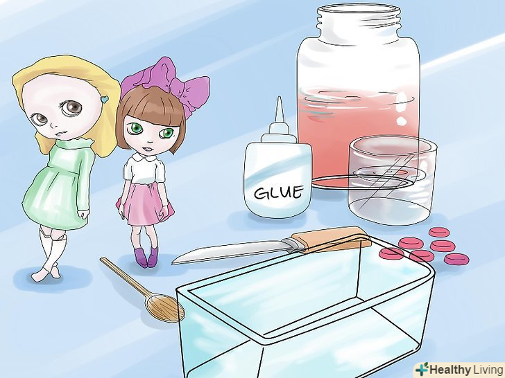 Підготуйте всі потрібні матеріали. вам знадобляться: кілька ляльок (від яких ви будете використовувати тільки голови), канцелярський ніж, ваза або інший резервуар, червоні скляні намиста, вода, клей, червона фарба і дерев'яна ложка.