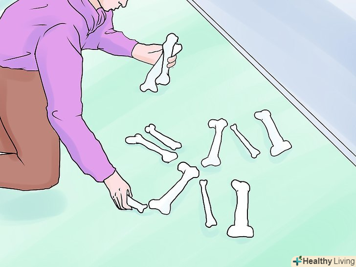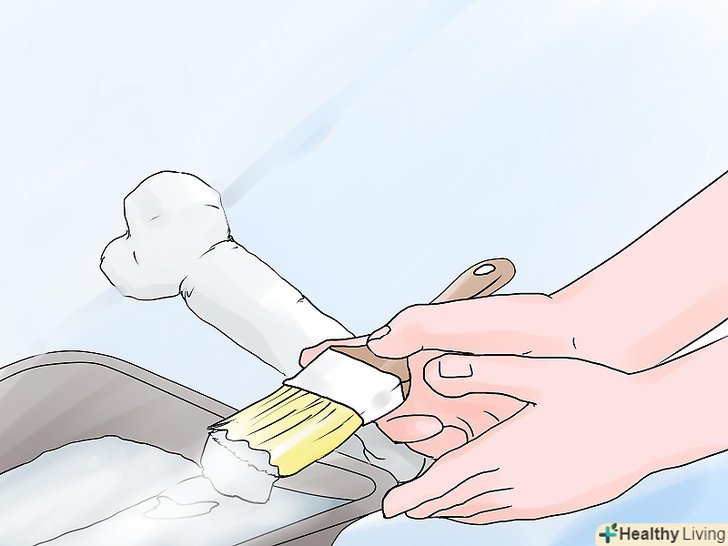 Покрийте паперову кістку гіпсовою тканиною. почніть з одного кінця кістки і рухайтеся вниз до іншого кінця. Повністю покрийте кістку шматками гіпсової тканини. Коли кістка повністю покрита, помістіть її в надійне місце і дайте висохнути. [2]- Потрібно кілька годин, щоб висохли кістки маленького розміру. Кістки великого розміру будуть сохнути близько доби. Перевірте, чи висохли кістки, помацавши їх. Нехай кістки продовжують сохнути, якщо пластир все ще вологий або злегка липкий.