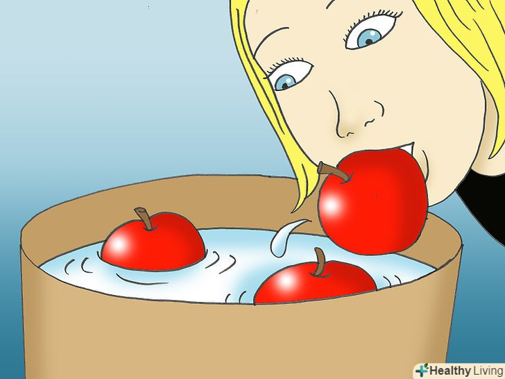 Ігри та заняття:- Підстрибування за яблуками. Дістаньте досить великі миски з водою для кожного гостя окремо. Покладіть в кожну миску з водою яблука. Будь-хто, хто першим дістане всі яблука з миски тільки за допомогою свого рота, виграє.