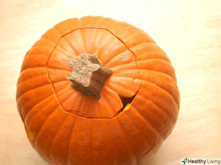 Зробіть отвір, через яке буде виходити дим. що б уникнути ситуації, коли свічка починає підсмажувати гарбуз зсередини, залиште свічку підпаленої на пару хвилин і ви побачите, в якому місці гарбуз починає підгоряти; це місце і буде вашим «димоходом», виріжте його.- Виріжте отвір зверху, що залишився відкладіть.
