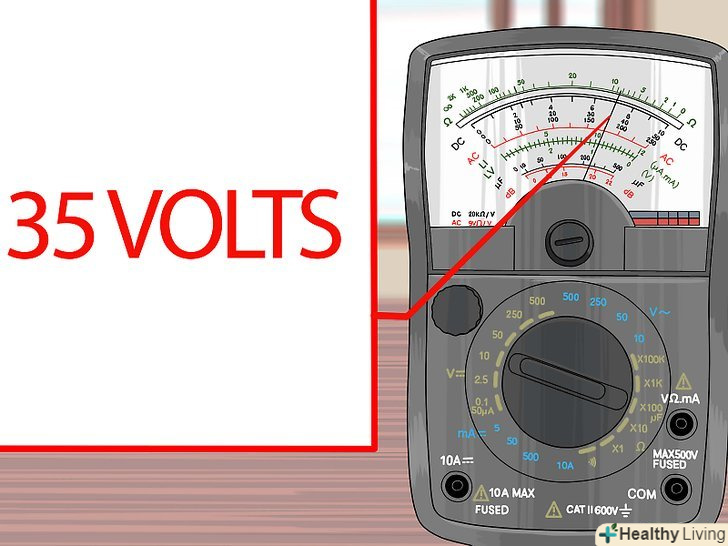 Вирахуйте передбачуване положення стрілки на підставі сусідніх цифр. це лінійна шкала, як лінійка.- Наприклад, стрілка вказує на середину відрізка між 30 і 40, значить, напруга дорівнює 35V.