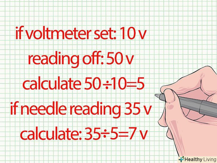 Розділіть отриманий показник, якщо використовуєте іншу шкалу.пропустіть цей крок, якщо отримуєте показники зі шкали, яка точно відповідає налаштувань вольтметра. В іншому випадку зробіть поправку, розділивши вказане на шкалі максимальне значення на Налаштування вашого вольтметра. Розділіть число, на яке вказує стрілка, на отриману відповідь, щоб дізнатися фактичну напругу.- Наприклад, якщо вольтметр встановлений на 10V, але ви зчитуєте показники зі шкали 50V, підрахуйте: 50 ? 10 =5. Якщо стрілка показує на 35V, фактична напруга буде: 35 ? 5 = 7V.