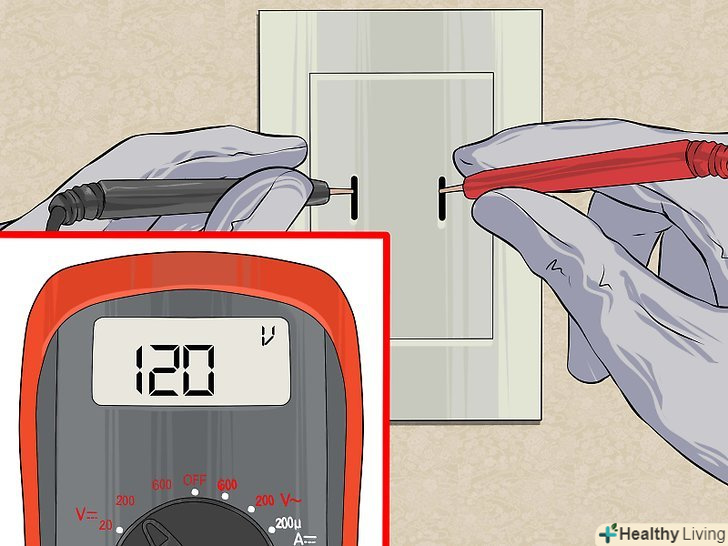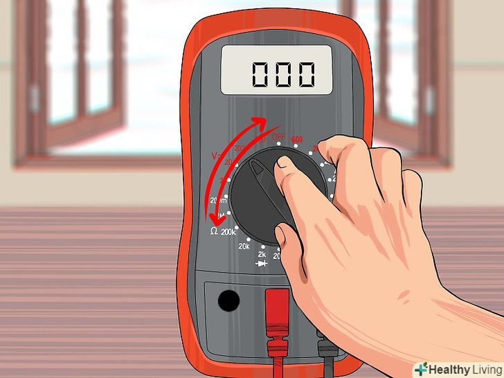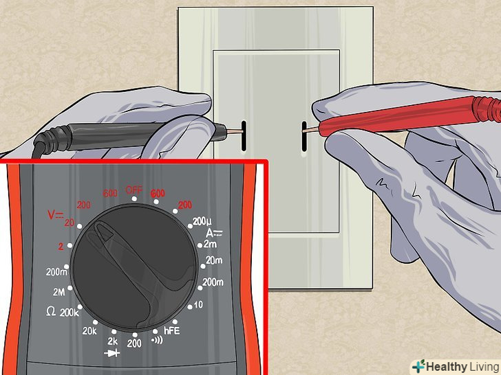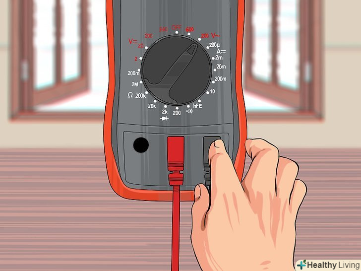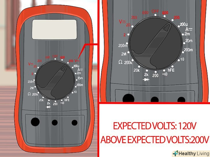 Налаштування прилад для вимірювання вольтажу.більшість приладів для вимірювання вольтажу насправді є "мультиметрами", які дозволяють перевірити кілька параметрів електричного струму. Якщо на вашому приладі є перемикач з декількома настройками, встановіть наступні:[1]- Для перевірки напруги в мережі змінного струму, встановіть перемикач наV~, ACVабо VAC. Побутові електромережі майже завжди зі змінним струмом.