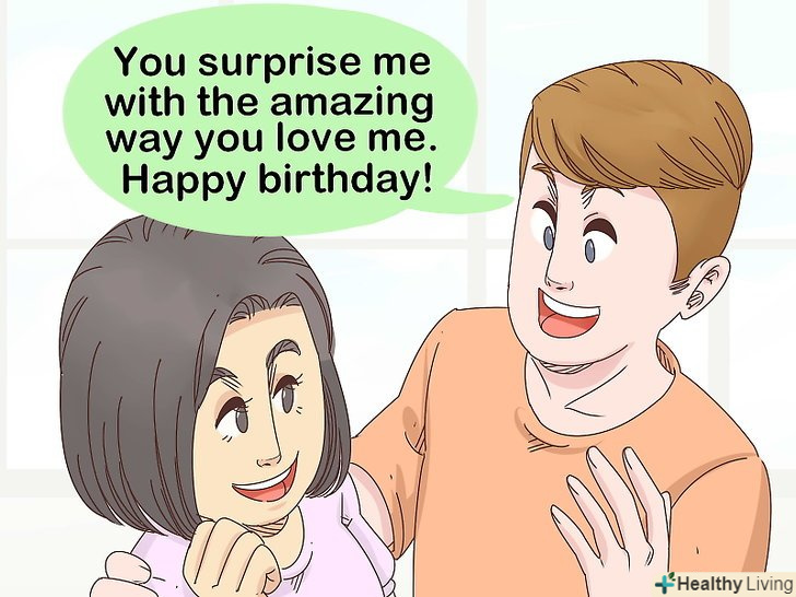 Розкажіть дорогому імениннику, що вам в ньому подобається. ось вдалий момент, щоб показати свою любов! Згадайте, яку радість приносять вам ваші відносини і що хорошого ви дізналися про нього за минулий рік. Буде забавно, якщо ви вставите жарт, зрозумілу тільки вам двом, або розпишете, що б вам ще хотілося відсвяткувати разом в наступному році. [4]- Можна сказати що-небудь на кшталт: «здавалося, що краще вже не буває, але ти кожен раз приємно дивуєш мене. З днем народження"» Або: «бажаю тобі, дорогий мій чоловік, щоб твій день народження був так само прекрасний, як і ти сам!»