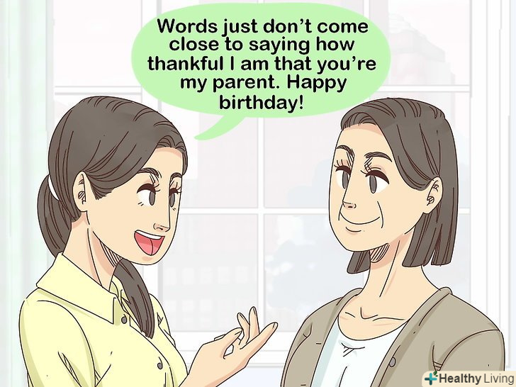 Висловіть подяку, якщо мова йде про день народження батька. знайдіть час, щоб зателефонувати батькові або побачитися з ним, щоб особисто передати свої побажання на день народження. Подякуйте йому за те, що він означає для вас, і будьте щирі при цьому. Якщо у вас напружені відносини з батьком, нічого страшного-постарайтеся згадати, що вони у вас є і що їх свято — це особливий привід сказати «спасибі» або просто «з днем народження». [5]- Скажіть, наприклад: "важко висловити словами, як я радий, що у мене такий батько. З днем народження, ТАТО!"Або щось подібне:" я знаю, що сьогодні я став тим, ким став, тому що ти, мама, була поруч зі мною, спасибі тобі-я сподіваюся, у тебе буде найщасливіший день народження!»