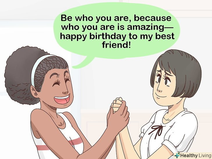 У день народження кращого друга підкресліть те, чим він унікальний. згадайте будь — які моменти — сентиментальні, смішні, дивні, випадкові, - щоб показати своєму другові те особливе, що є між вами. Скажіть це особисто, будьте чесні і щирі у своїй подяки, щоб іменинник в день народження відчував себе особливо приємно. [6]- " Нехай Твій день народження буде солодким як торт, і нехай в майбутньому році у тебе буде стільки ж радості, скільки ти доставляєш своїм близьким!"- і: "залишайся таким, який ти є, тому що ти найкращий і Ти — мій найкращий друг. З днем народження!"Ось два приклади короткого і приємного привітання. [7]