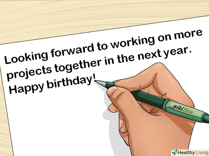 Надайте привітання з днем народження для вашого колеги більш особисте звучання. коли всі будуть по колу підписувати вітальну листівку, на хвилинку відверніться, щоб написати щось більше, ніж просто «з днем народження». Залежно від того, наскільки добре ви знаєте іменинника, можна написати: «всього найкращого на рік вперед», — або більш конкретно: «бажаю побільше спільних проектів в майбутньому». [8]- Не забудьте підписатися під поздоровленням, щоб було зрозуміло, від кого воно.
