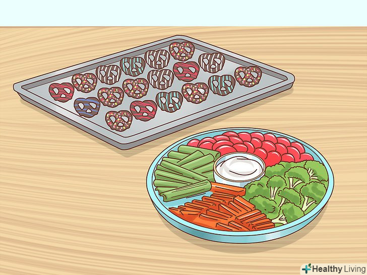 Запасіться простою їжею. дітей дуже легко здивувати. Якщо ви зробите миску сосисок в тесті, діти будуть дуже задоволені. Також припасіть ще кілька більш здорових закусок (кренделі, вегетаріанську нарізку), на додаток до солодкого і снеків, наприклад, чіпси з соусом.- Час вечірки визначить характер їжі. Якщо це післяобідній час, вам будуть потрібні тільки закуски. У вас вечірка під час основних прийомів їжі? Постарайтеся замовити піцу або взяти їжу на винос. Що буде найголовнішим? Звичайно ж, торт!